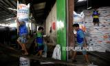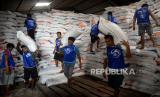 Pekerja mengangkat beras saat bongkar muat di Pasar Induk Beras Cipinang, Jakarta, Rabu (4/10/2023). Menteri BUMN Erick Thohir memastikan stok beras aman untuk Oktober dan November 2023. Tercatat pada Oktober ketersediaan beras Perum Bulog sebanyak 1,7 juta ton dan ditargetkan menjadi 2 juta ton pada November 2023. (FOTO : Republika/Prayogi)