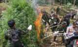 Personel gabungan Badan Narkotika Nasional (BNN), TNI dan Polri membakar tanaman ganja dalam operasi pemusnahan ladang tersebut di Dusun Alue le Mudek, Desa Teupin Rusep, Sawang, Aceh Utara, Aceh, Rabu (4/10/2023). Data rekapitulasi BNN RI menyebutkan selama tahun 2023 sebanyak 20 titik atau seluas 16,2 hektare lahan tanaman ganja dengan berat total 66,5 ton tanaman ganja di Aceh telah dimusnahkan. ANTARA FOTO/Rahmad/aww. (FOTO : ANTARA FOTO/Rahmad)
