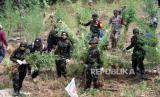 Personel gabungan Badan Narkotika Nasional (BNN), TNI dan Polri mencabuti tanaman ganja di atas lahan seluas empat hektare yang ditanami sekitar delapan ton tanaman ganja dalam operasi pemusnahan ladang tersebut di Dusun Alue le Mudek, Desa Teupin Rusep, Sawang, Aceh Utara, Aceh, Rabu (4/10/2023). Data rekapitulasi BNN RI menyebutkan selama tahun 2023 sebanyak 20 titik atau seluas 16,2 hektare lahan tanaman ganja dengan berat total 66,5 ton tanaman ganja di Aceh telah dimusnahkan. (FOTO : ANTARA FOTO/Rahmad)
