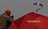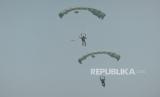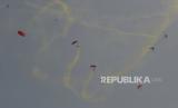 Penerjun payung beraksi dalam demo udara saat perayaan HUT ke-78 TNI di kawasan Monas, Jakarta, Kamis (5/10/2023). Atraksi udara berupa terjun payung dan pesawat terbang ini digelar sebagai rangkaian dalam peringatan HUT ke -78 TNI. Aksi terjun payung ini menjadi salah satu hal yang dinantikan publik, sebab 78 personel yang terjun payung akan memberikan buket bunga kepada Ibu Negara Iriana Joko Widodo. Selain itu, kegiatan tersebut juga menampilkan atraksi demo udara yang melibatkan 91 pesawat, yang terdiri dari fly pass pesawat tempur, heli, dan free fall oleh 78 personel. Perayaan HUT ke-78 TNI tahun ini bertemakan (FOTO : Republika/Thoudy Badai)