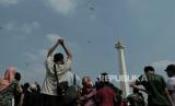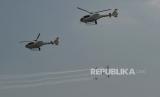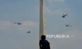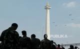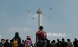Atraksi udara saat perayaan HUT ke-78 TNI di kawasan Monas, Jakarta, Kamis (5/10/2023). Atraksi udara berupa terjun payung dan pesawat terbang ini digelar sebagai rangkaian dalam peringatan HUT ke -78 TNI. Aksi terjun payung ini menjadi salah satu hal yang dinantikan publik, sebab 78 personel yang terjun payung akan memberikan buket bunga kepada Ibu Negara Iriana Joko Widodo. Selain itu, kegiatan tersebut juga menampilkan atraksi demo udara yang melibatkan 91 pesawat, yang terdiri dari fly pass pesawat tempur, heli, dan free fall oleh 78 personel. Perayaan HUT ke-78 TNI tahun ini bertemakan (FOTO : Republika/Thoudy Badai)