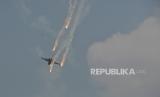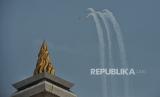 Atraksi udara pesawat saat perayaan HUT ke-78 TNI di kawasan Monas, Jakarta, Kamis (5/10/2023). Atraksi udara berupa terjun payung dan pesawat terbang ini digelar sebagai rangkaian dalam peringatan HUT ke -78 TNI. Aksi terjun payung ini menjadi salah satu hal yang dinantikan publik, sebab 78 personel yang terjun payung akan memberikan buket bunga kepada Ibu Negara Iriana Joko Widodo. Selain itu, kegiatan tersebut juga menampilkan atraksi demo udara yang melibatkan 91 pesawat, yang terdiri dari fly pass pesawat tempur, heli, dan free fall oleh 78 personel. Perayaan HUT ke-78 TNI tahun ini bertemakan (FOTO : Republika/Thoudy Badai)