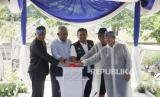 PJ Wali Kota Bandung Bambang Tirtoyuliono (kedua kiri), Sekda Kota Bandung Ema Sumarna (kiri), Ketua DPRD Kota BandungTedy Rusmawan dan Kepala Dinas Sumber Daya Air dan Bina Marga, (DSDABM) Kota Bandung, Didi Ruswandi (kedua kanan) bersama-sama menekan sirine saat Pencanangan Mapag Hujan atau menyambut hujan, di Jalan Sor GBLA, Rancabolang, Kecamatan Gedebage, Kamis (5/10/2023). Program Mapag Hujan merupakan upaya pemerintah memitigasi agar bencana banjir tidak terus terulang di Kota Bandung, salah satunya dengan membersihkan saluran air dan sungai. (FOTO : Edi Yusuf/Republika)