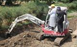 PJ Wali Kota Bandung Bambang Tirtoyuliono dan Sekda Kota Bandung Ema Sumarna, menaiki beko mini mengeruk kolam retensi saat Pencanangan Mapag Hujan atau menyambut hujan, di Jalan Sor GBLA, Rancabolang, Kecamatan Gedebage, Kamis (5/10/2023). Program Mapag Hujan merupakan upaya pemerintah memitigasi agar bencana banjir tidak terus terulang di Kota Bandung, salah satunya dengan membersihkan saluran air dan sungai. (FOTO : Edi Yusuf/Republika)