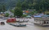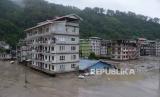 Bangunan terendam banjir setelah banjir bandang yang dipicu oleh hujan deras yang tiba-tiba membanjiri kota Rangpo di Sikkim, India, Kamis, (5/10/2023). (FOTO : AP Photo/Prakash Adhikari)