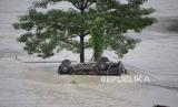 Sebuah kendaraan yang hanyut tergeletak di bawah pohon setelah banjir bandang yang dipicu oleh hujan deras yang tiba-tiba membanjiri kota Rangpo di Sikkim, India, Kamis, (5/10/2023). (FOTO : AP Photo/Prakash Adhikari)