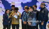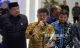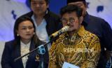 Menteri Pertanian Syahrul Yasin Limpo (SYL) memberikan keterangan pers di Nasdem Tower, Jakarta, Kamis (5/10/2023). Dalam keterangannya SYL menyampaikan telah menjalani pemeriksaan di Polda Metro Jaya untuk memberikan keterangan terkait dugaan pemerasan yang dilakukan oleh Pimpinan KPK. Sebelumnya KPK telah melakukan penggeledahan dirumah dinas Syahrul Yasin Limpo (tengah) pada Kamis (28/9) hingga Jumat (29/9) lalu terkait dugaan kasus korupsi di Kementerian Pertanian. Menanggapi dugaan kasus tersebut, Ketua Umum Partai Nasdem Surya Paloh meminta SYL segera mengundurkan diri dari jabatannya sebagai Menteri Pertanian untuk menghormati proses penyidikan kasus dugaan korupsi yang menyeretnya. (FOTO : Republika/Thoudy Badai)