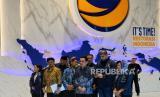 Menteri Pertanian Syahrul Yasin Limpo (SYL) (kedua kiri) memberikan keterangan pers di Nasdem Tower, Jakarta, Kamis (5/10/2023). Dalam keterangannya SYL menyampaikan telah menjalani pemeriksaan di Polda Metro Jaya untuk memberikan keterangan terkait dugaan pemerasan yang dilakukan oleh Pimpinan KPK. Sebelumnya KPK telah melakukan penggeledahan dirumah dinas Syahrul Yasin Limpo pada Kamis (28/9) hingga Jumat (29/9) lalu terkait dugaan kasus korupsi di Kementerian Pertanian. Menanggapi dugaan kasus tersebut, Ketua Umum Partai Nasdem Surya Paloh meminta SYL segera mengundurkan diri dari jabatannya sebagai Menteri Pertanian untuk menghormati proses penyidikan kasus dugaan korupsi yang menyeretnya. (FOTO : Republika/Thoudy Badai)
