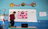 Seorang guru melakukan pembelajaran secara daring di Sekolah Dasar (SD) Negeri 205 Palembang, Sumatera Selatan, Jumat (6/10/2023). Dinas Pendidikan Kota Palembang menerapkan kegiatan belajar jarak jauh atau daring untuk siswa TK,SD dan SMP akibat dampak buruk bencana kabut asap yang melanda Kota Palembang. (FOTO : ANTARA FOTO/Nova Wahyudi)