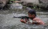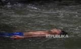 Anak-anak berenang di aliran Sungai Ciliwung yang menyusut di Bendungan Katulampa, Kota Bogor, Jawa Barat, Jumat (6/10/2023). Debit air Sungai Ciliwung mengalami penurunan drastis akibat musim kemarau sejak Juni 2023. Tercatat pada hari ini ketinggian air sungai Ciliwung di Bendungan Katulampa hanya setinggi 2 sentimeter. (FOTO : Republika/Putra M. Akbar)