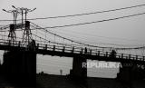 Warga berjalan melewati jembatan Bendungan Katulampa di Kota Bogor, Jawa Barat, Jumat (6/10/2023). Debit air Sungai Ciliwung mengalami penurunan drastis akibat musim kemarau sejak Juni 2023. Tercatat pada hari ini ketinggian air sungai Ciliwung di Bendungan Katulampa hanya setinggi 2 sentimeter. (FOTO : Republika/Putra M. Akbar)
