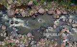 Foto udara aliran Sungai Ciliwung yang menyusut di Bendungan Katulampa, Kota Bogor, Jawa Barat, Jumat (6/10/2023). Debit air Sungai Ciliwung mengalami penurunan drastis akibat musim kemarau sejak Juni 2023. Tercatat pada hari ini ketinggian air sungai Ciliwung di Bendungan Katulampa hanya setinggi 2 sentimeter. (FOTO : Republika/Putra M. Akbar)