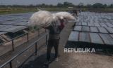 Pekerja membawa mi soun setelah proses jemur di Ngawen, Klaten, Jawa Tengah, Jumat (6/10/2023). Mi soun yang diproduksi secara tradisional dengan memanfaatkan cahaya matahari untuk proses pengeringan itu, saat musim kemarau ini dapat mengolah bahan tepung aren kurang lebih sebanyak 500 kilogram per hari yang dijual dengan harga Rp23 ribu per kilogram mi soun. (FOTO :  ANTARA FOTO/Aloysius Jarot Nugroho)