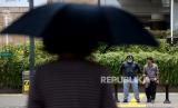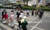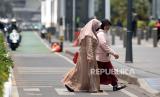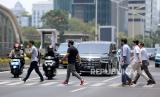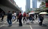 REPUBLIKA.CO.ID, JAKARTA -- Warga berjalan saat berlangsungnya fenomena alam kulminasi utama matahari di kawasan Bundaran HI, Jakarta, Senin (9/10/2023).