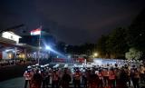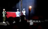 Pasukan menurunkan bendera merah putih dalam Upacara Parade Senja di Lapangan Bela Negara, Kementerian Pertahanan, Jakarta, Senin (9/10/2023). Pasukan mengikuti Upacara Parade Senja di Lapangan Bela Negara, Kementerian Pertahanan, Jakarta, Senin (9/10/2023). Upacara parade senja yang ditandai dengan penuruan bendera merah putih tersebut merupakan bagian dari rangkaian hari ulang tahun (HUT) ke-78 Tentara Nasional Indonesia (TNI). (FOTO : Republika/Prayogi)
