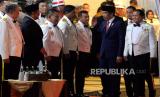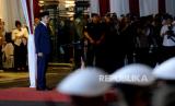 Presiden Joko Widodo saat memimpin Upacara Parade Senja di Lapangan Bela Negara, Kementerian Pertahanan, Jakarta, Senin (9/10/2023). Upacara parade yang ditandai dengan penuruan bendera merah putih tersebut merupakan bagian dari rangkaian hari ulang tahun (HUT) ke-78 Tentara Nasional Indonesia (TNI). (FOTO : Republika/Prayogi)