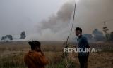 Warga mengamati lahan yang terbakar di dekat rumahnya di Desa Teluk Kecapi, Pemulutan, Ogan Ilir (OI), Sumatera Selatan, Senin (9/10/2023). Petugas masih terus berupaya melakukan pemadaman kebakaran lahan di daerah tersebut. (FOTO : Antara/Nova Wahyudi)