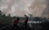 REPUBLIKA.CO.ID,OGAN ILIR -- Petugas Manggala Agni Daops Banyuasin berupaya melakukan pemadaman kebakaran lahan yang mendekati permukiman di Desa Muara Baru, Pemulutan, Ogan Ilir (OI), Sumatra Selatan, Senin (9/10/2023).
