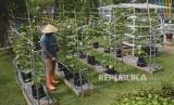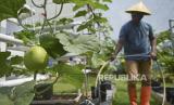 REPUBLIKA.CO.ID,JAKARTA -- Pengelola kebun menyiram tanaman melon di Ruang Publik Terpadu Ramah Anak (RPTRA) Kalijodo, Jakarta, Senin (9/10/2023).