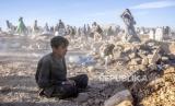 Seorang anak laki-laki Afghanistan berduka di samping makam adik laki-lakinya yang meninggal akibat gempa bumi, di distrik Zenda Jan di provinsi Herat, sebelah barat Afghanistan, Senin (9/10/2023). (FOTO : AP Photo/Ebrahim Noroozi)