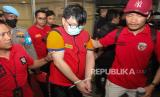 Polisi menghadirkan tersangka R (tengah) yang merupakan putra seorang anggota DPR RI saat rekonstruksi kasus penganiayaan di parkiran bawah tanah Lenmarc Mall, Surabaya, Jawa Timur, Selasa (10/10/2023). Rekonstruksi sebanyak 41 adegan reka ulang itu diperagakan dalam kasus dugaan penganiayaan yang mengakibatkan korban bernama Dini Sera Afrianti meninggal dunia. (FOTO : Antara/Didik Suhartono )