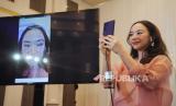 REPUBLIKA.CO.ID,JAKARTA -- Pemengaruh kecantikan Putri Caya sedang menscaan wajah melalui HP dengan fitur skin test dalam acara satu tahun LazBeauty di Jakarta, Selasa (10/10/2023).