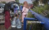 REPUBLIKA.CO.ID, JAKARTA -- Warga mengisi air bersih ke dalam galon di PDAM Tirta Raharja, Cimahi Utara, Kota Cimahi, Jawa Barat, Rabu (11/10/2023).