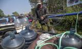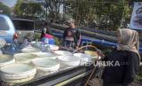 Warga mengisi air bersih ke dalam galon di PDAM Tirta Raharja, Cimahi Utara, Kota Cimahi, Jawa Barat, Rabu (11/10/2023). Berdasarkan data dari BPBD Provinsi Jawa Barat hingga (10/10/2023), sebanyak 287.288 kepala keluarga (KK) dari 23 kabupaten dan kota di Jawa Barat terdampak kekeringan berupa kekurangan air bersih. (FOTO : ABDAN SYAKURA/REPUBLIKA)