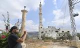 Seorang pria memotret sebuah masjid yang rusak di desa Dhayra, Lebanon selatan dekat perbatasan Lebanon-Israel, Lebanon, (11/10/2023). (FOTO : EPA-EFE/WAEL HAMZEH)