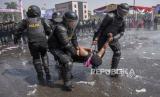 Petugas kepolisian mengevakuasi pengunjuk rasa yang terluka saat Latihan Gabungan Fungsi Tingkat Polda di Lapangan Brigif 15 Kujang Cimahi, Kota Cimahi, Jawa Barat, Kamis (12/10/2023). Latihan tersebut diselenggarakan oleh jajaran Polda Jawa Barat bersama pihak terkait lainnya. Kegiatan itu bertujuan untuk meningkatkan kesiapsiagaan anggota Polri dan pihak terkait lainnya dalam mengantisipasi gangguan kamtibmas, serta pengamanan selama rangkaian proses pelaksanaan Pemilu 2024. (FOTO : ABDAN SYAKURA/REPUBLIKA)