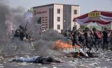 Petugas kepolisian mengamankan pengunjuk rasa yang anarkis saat Latihan Gabungan Fungsi Tingkat Polda di Lapangan Brigif 15 Kujang Cimahi, Kota Cimahi, Jawa Barat, Kamis (12/10/2023). Latihan tersebut diselenggarakan oleh jajaran Polda Jawa Barat bersama pihak terkait lainnya. Kegiatan itu bertujuan untuk meningkatkan kesiapsiagaan anggota Polri dan pihak terkait lainnya dalam mengantisipasi gangguan kamtibmas, serta pengamanan selama rangkaian proses pelaksanaan Pemilu 2024. (FOTO : ABDAN SYAKURA/REPUBLIKA)