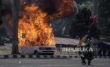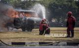 Petugas pemadam kebakaran memadamkan api yang membakar mobil saat Latihan Gabungan Fungsi Tingkat Polda di Lapangan Brigif 15 Kujang Cimahi, Kota Cimahi, Jawa Barat, Kamis (12/10/2023). Latihan tersebut diselenggarakan oleh jajaran Polda Jawa Barat bersama pihak terkait lainnya. Kegiatan itu bertujuan untuk meningkatkan kesiapsiagaan anggota Polri dan pihak terkait lainnya dalam mengantisipasi gangguan kamtibmas, serta pengamanan selama rangkaian proses pelaksanaan Pemilu 2024. (FOTO : ABDAN SYAKURA/REPUBLIKA)