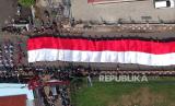 Foto udara personel gabungan TNI Polri membawa bendera merah putih berukuran 5x100 meter saat Kirab Bendera Merah Putih di Cibinong, Kabupaten Bogor, Jawa Barat, Kamis (12/10/2023). Kirab Merah Putih tersebut merupakan salah satu rangkaian acara Maulid Akbar Nabi Besar Muhammad SAW dan Tausiah Kebangsaan 1445 H/2023 M di Bogor. (FOTO : ANTARA FOTO/Yulius Satria Wijaya)