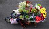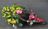 Seorang pedagang kaki lima yang menjual bunga mengendarai sepeda motor di sepanjang jalan di Hanoi, Vietnam, Kamis (12/10/2023). (FOTO : EPA-EFE/LUONG THAI LINH)