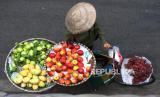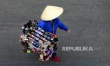 REPUBLIKA.CO.ID, HANOI -- Seorang pedagang kaki lima yang menjual buah-buahan berjalan di sepanjang jalan di Hanoi, Kamis (12/10/2023). Pedagang keliling mengunakan sepeda, motor hingga troli bayi di Hanoi rata-rata mengunakan topi caping menawarkan dagangannya dari buah-buahan, sayuran, hingga kebutuhan sehari-hari.