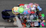 Seorang pedagang kaki lima yang menjual jepit rambut berjalan di sepanjang jalan di Hanoi, Vietnam, Kamis (12/10/2023). (FOTO : EPA-EFE/LUONG THAI LINH)