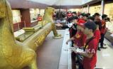 Pengunjung mengamati koleksi Museum Sri Baduga, di Kota Bandung, Kamis (12/10/2023). Saat musim study tour, Musium Sri Baduga selalu ramai pengunjung. Museum ini merupakan salah satu tempat wisata edukasi yang menghadirkan koleksi benda budaya dan bersejarah yang sudah ada sejak masa kerajaan dan zaman purba. Museum Sri Baduga berperan penting dalam memahami akar-akar budaya Sunda yang mendalam. (FOTO : Edi Yusuf/Republika)