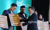 Komisaris Utama merangkap Komisaris Independen BSI Muliaman D Hadad menyerahkan piagam penghargaan kepada penerima BSI Aceh Muslimpreneur dalam acara Awarding Talenta Wirausaha BSI dan BSI Aceh Muslimpreneur di Jakarta, Kamis (12/10/2023). PT Bank Syariah Indonesia Tbk menggelar Awarding Talenta Wirausaha BSI dan BSI Aceh Muslimpreneur sebagai upaya mendukung pengembangan ekosistem kewirausahaan bagi anak muda baik di pasar lokal maupun internasional. Lewat program tersebut BSI berharap mampu mendorong ekonomi syariah sebagai instrumen ekonomi yang berperan dalam mendorong ekonomi keumatan salah satunya melalui sektor UMKM. (FOTO : Republika/Thoudy Badai)
