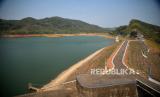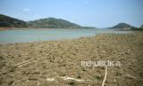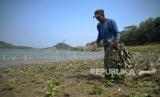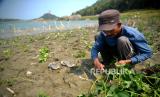 Air waduk Waduk Sempor yang surut imbas kemarau di Kebumen, Jawa Tengah, Kamis (12/10/2023). Warga sekitar Waduk Sermo memanfaatkan surutnya air waduk akibat kemarau dengan berbagai cara. Beberapa warga memilih untuk menanam aneka palawija di bagian waduk yang mengering. Selain itu, ada juga yang mencari kerang air tawar untuk menambah penghasilan, setiap kilogram daging kerang air tawar dijual Rp 50 ribu. Ada juga warga yang mencari rumput untuk pakan ternak di seberang waduk, dan rumput dijual kembali seharga Rp 25 ribu per karung. (FOTO : Republika/Wihdan Hidayat)
