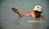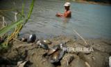 Warga mencari kerang air tawar memanfaatkan surutnya Waduk Sempor di Kebumen, Jawa Tengah, Kamis (12/10/2023). Warga sekitar Waduk Sempor memanfaatkan surutnya air waduk akibat kemarau dengan berbagai cara. Beberapa warga memilih untuk menanam aneka palawija di bagian waduk yang mengering. Selain itu, ada juga yang mencari kerang air tawar untuk menambah penghasilan, setiap kilogram daging kerang air tawar dijual Rp 50 ribu. Ada juga warga yang mencari rumput untuk pakan ternak di seberang waduk, dan rumput dijual kembali seharga Rp 25 ribu per karung. (FOTO : Republika/Wihdan Hidayat)
