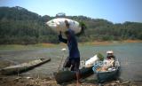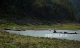 Warga membawa rumput menggunakan perahu di Waduk Sempor, Kebumen, Jawa Tengah, Kamis (12/10/2023). Warga sekitar Waduk Sempor memanfaatkan surutnya air waduk akibat kemarau dengan berbagai cara. Beberapa warga memilih untuk menanam aneka palawija di bagian waduk yang mengering. Selain itu, ada juga yang mencari kerang air tawar untuk menambah penghasilan, setiap kilogram daging kerang air tawar dijual Rp 50 ribu. Ada juga warga yang mencari rumput untuk pakan ternak di seberang waduk, dan rumput dijual kembali seharga Rp 25 ribu per karung. (FOTO : Republika/Wihdan Hidayat)