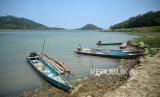 Perahu milik warga untuk mencari ikan atau rumput memanfaatkan surutnya Waduk Sempor di Kebumen, Jawa Tengah, Kamis (12/10/2023). Warga sekitar Waduk Sempor memanfaatkan surutnya air waduk akibat kemarau dengan berbagai cara. Beberapa warga memilih untuk menanam aneka palawija di bagian waduk yang mengering. Selain itu, ada juga yang mencari kerang air tawar untuk menambah penghasilan, setiap kilogram daging kerang air tawar dijual Rp 50 ribu. Ada juga warga yang mencari rumput untuk pakan ternak di seberang waduk, dan rumput dijual kembali seharga Rp 25 ribu per karung. (FOTO : Republika/Wihdan Hidayat)