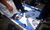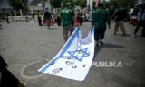 Peserta aksi dari Forum Umat Islam menginjak bendera Israel saat Indonesia Turun Tangan Bantu Palestina di Titik Nol Yogyakarta, Jumat (13/10/2023). Pada aksi damai menyikapi pertempuran Israel-Palestina ini mereka menyerukan Pemerintah untuk ikut membantu Palestina dengan menggalang bantuan internasional. Selain itu, mereka juga melakukan penggalangan dana untuk membantu perjuangan rakyat Palestina. Pada akhir aksi peserta berdoa qunut nazilah bersamaan dengan Shalat Ashar berjamaah di lokasi aksi. (FOTO : Republika/Wihdan Hidayat)
