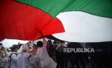 Peserta aksi dari Forum Umat Islam membawa bendera raksasa Palestina saat Indonesia Turun Tangan Bantu Palestina di Titik Nol Yogyakarta, Jumat (13/10/2023). Pada aksi damai menyikapi pertempuran Israel-Palestina ini mereka menyerukan Pemerintah untuk ikut membantu Palestina dengan menggalang bantuan internasional. Selain itu, mereka juga melakukan penggalangan dana untuk membantu perjuangan rakyat Palestina. Pada akhir aksi peserta berdoa qunut nazilah bersamaan dengan Shalat Ashar berjamaah di lokasi aksi. (FOTO : Republika/Wihdan Hidayat)