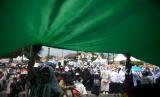 Peserta aksi dari Forum Umat Islam mengikuti Indonesia Turun Tangan Bantu Palestina di Titik Nol Yogyakarta, Jumat (13/10/2023). Pada aksi damai menyikapi pertempuran Israel-Palestina ini mereka menyerukan Pemerintah untuk ikut membantu Palestina dengan menggalang bantuan internasional. Selain itu, mereka juga melakukan penggalangan dana untuk membantu perjuangan rakyat Palestina. Pada akhir aksi peserta berdoa qunut nazilah bersamaan dengan Shalat Ashar berjamaah di lokasi aksi. (FOTO : Republika/Wihdan Hidayat)