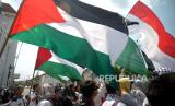 Peserta aksi dari Forum Umat Islam membawa bendera Palestina saat mengikuti Indonesia Turun Tangan Bantu Palestina di Titik Nol Yogyakarta, Jumat (13/10/2023). Pada aksi damai menyikapi pertempuran Israel-Palestina ini mereka menyerukan Pemerintah untuk ikut membantu Palestina dengan menggalang bantuan internasional. Selain itu, mereka juga melakukan penggalangan dana untuk membantu perjuangan rakyat Palestina. Pada akhir aksi peserta berdoa qunut nazilah bersamaan dengan Shalat Ashar berjamaah di lokasi aksi. (FOTO : Republika/Wihdan Hidayat)