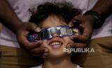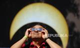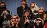 Penonton menggunakan kacamata khusus untuk menyaksikan saat bulan bergerak di depan matahari saat terjadi gerhana matahari cincin atau cincin api, di San Antonio,  (FOTO : AP Photo/Eric Gay)