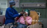 Perawat melakukan pemeriksaan sebelum tindakan operasi pada acara Bakti Sosial Operasi Mata Juling JEC di RS Mata JEC @ Menteng, Jakarta, Sabtu (14/10/2023). JEC Eye Hospitals and Clinics mengadakan kembali kembali Bakti Sosial Operasi Mata Juling JEC untuk memberikan edukasi serta tindakan operasi mata juling gratis sekaligus memperingati World Sight Day 2023. (FOTO : Republika/Putra M. Akbar)