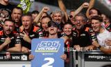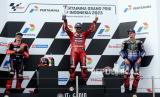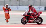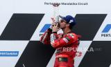 Pembalap MotoGP Italia Francesco Bagnaia dari Tim Ducati Lenovo merayakan usai menjuarai Grand Prix Sepeda Motor Indonesia di Sirkuit Internasional Pertamina Mandalika di Pulau Lombok, Indonesia, Ahad (15/10/2023). (FOTO : EPA-EFE/ADI WEDA)