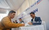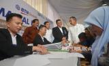 Direktur Consumer Bank BTN Hirwandi Gafar (kanan), bersama Komisioner BP Tapera Adi Setianto (kiri) saat menghadiri acara Akad Massal KPR Syariah Serentak di Perumahan Hadrah Land, Kabupaten Aceh Besar, Provinsi Aceh, Jumat (13/10/2023). Unit Usaha Syariah (UUS) PT Bank Tabungan Negara (Persero) Tbk (BTN Syariah) siap menjadi bank terbesar di Provinsi Aceh. Salah satunya dengan memperbesar pembiayaan perumahan di provinsi yang menerapkan aturan syariat Islam atau Qanun tersebut. Jumlah Akad Massal KPR Syariah Bank BTN Syariah di Aceh sebanyak 2.187 unit rumah yang terdiri dari 1.779 rumah Subsidi dan 364 rumah Non Subsidi ini diikuti oleh 33 Kantor Cabang Syariah (KCS) di seluruh Indonesia. (FOTO : Dok Republika)